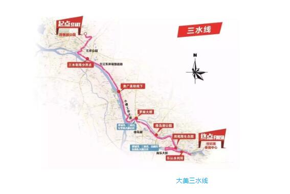 早上在現(xiàn)場激情歡騰的啟動儀式之后,隊伍從荷香湖公園出發(fā),途經(jīng)水韻橋,穿經(jīng)廣佛肇城軌北站動車橋底(即桃園西側),順臨江路東側人行道,往西南涌魔水光輝廣場公園,然后往三江水韻公園、紅頭巾廣場、環(huán)東路行人道、廣三高速南側單邊橋(人行橋)、右岸公園親水長廊、北江大堤,到達第一簽:三水南海分界點,行程十公里。