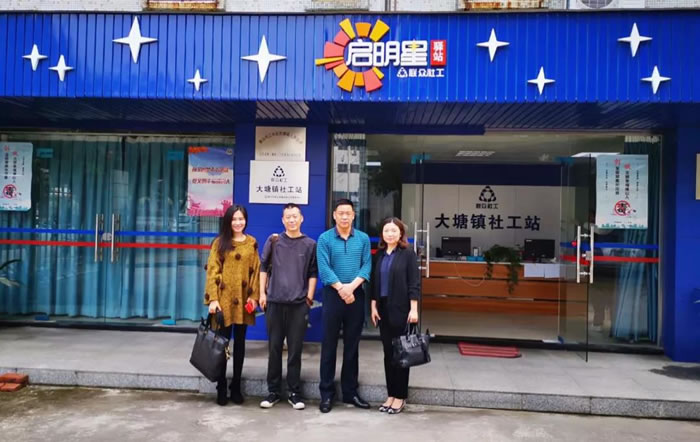 佛山市禁毒協會秘書長黃勰、副秘書長王毅堅與三水區禁毒協會副秘書長、廣東國盾特衛集團總經辦主任鄧淑芬在社工服務站前留影