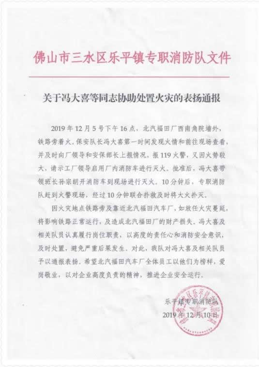 日前,三水區樂平鎮專職消防隊和北汽福田汽車廠特向我司和馮大喜等同志發來了表揚通報。
