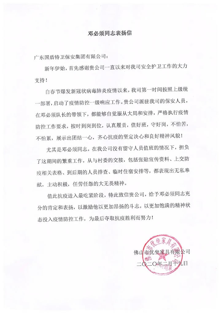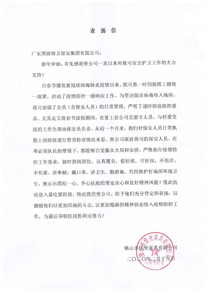 日前,佛山市優(yōu)坐家具有限公司客戶單位向集團(tuán)公司發(fā)來了表揚(yáng)信,感謝國盾特衛(wèi)保安集團(tuán)、感謝鄧必須同志在疫情期間勇于擔(dān)當(dāng),在沒有留守人員值班的情況下,擔(dān)負(fù)了這期間的繁重工作,從配合與村委會的工作開展,包括張貼企業(yè)防護(hù)宣傳資料、上報(bào)防疫信息相關(guān)表格,到后期的人員排查、臨時住宿安排等,都表現(xiàn)出無私奉獻(xiàn),主動積極作為,任勞任怨的大無畏精神。集團(tuán)公司董事長夏學(xué)樹獲悉后,號召集團(tuán)公司上下向鄧必須隊(duì)長學(xué)習(xí),并強(qiáng)調(diào)各保安部經(jīng)理、大隊(duì)長將這種愛崗敬業(yè)、勇于擔(dān)當(dāng)?shù)木駛鬟_(dá)至各個分隊(duì)。