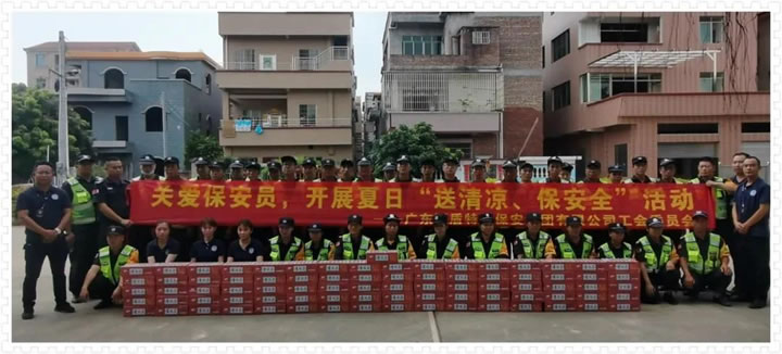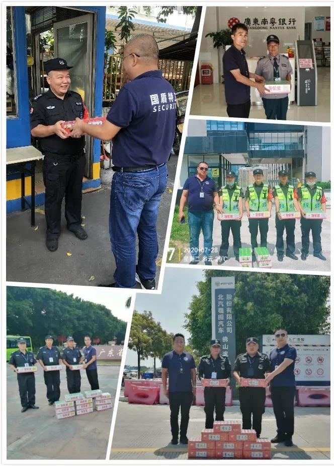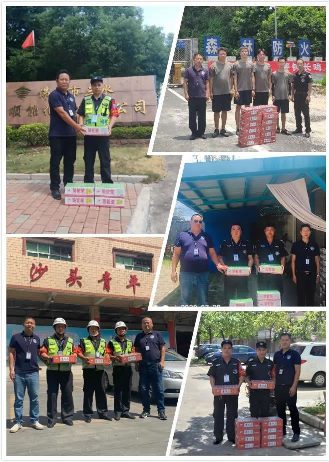 炎炎盛夏,高溫酷暑,國盾特衛(wèi)保安員頭頂驕陽、不畏酷暑、堅守崗位,堅持以高質(zhì)量、高標(biāo)準(zhǔn)的工作態(tài)度完成各項安保工作。為保障一線保安員的身心健康,切實做好夏季防暑降溫工作,廣東國盾特衛(wèi)保安集團(tuán)有限公司工會委員會組織服務(wù)管理部各級干部關(guān)心關(guān)愛保安員,開展夏日“送清涼、保安全”活動,確保一線基層保安員安全度夏,為堅守在高溫下一線工作的保安員送去了清涼和公司的關(guān)懷。