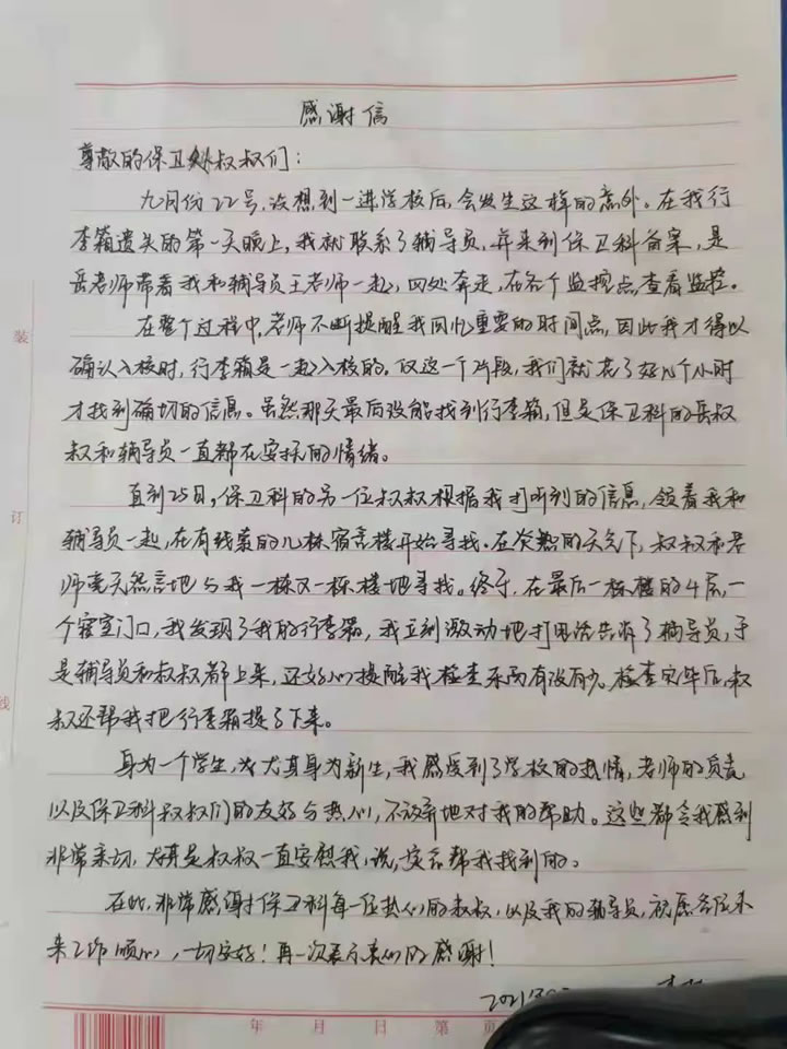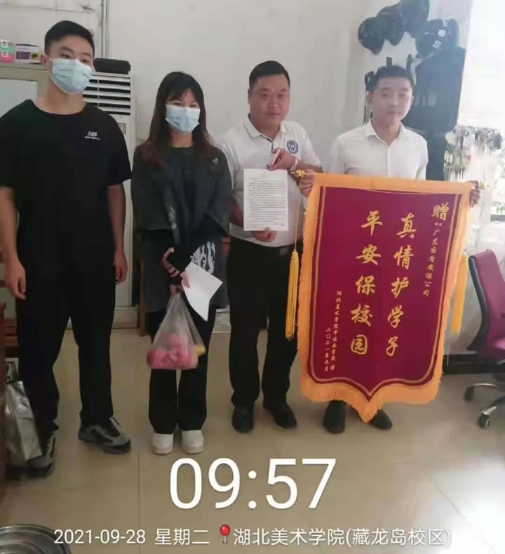 2021年9月28日早上,集團(tuán)湖北分公司駐湖北美術(shù)學(xué)院項目部值班室收到來自國畫系學(xué)生送來一面錦旗以及一封親筆書寫的感謝信。該學(xué)生為感謝我司駐項目經(jīng)理岳凌同志過去幾天幫助同學(xué)找回丟失的行李,特意親自遞上水果作為答謝心意,被岳凌經(jīng)理禮貌婉拒。岳經(jīng)理接過錦旗后表示這是一件很平常的小事,我們駐守校園的初心就是全心全意為校園師生服務(wù),堅持做好自己的本職工作。