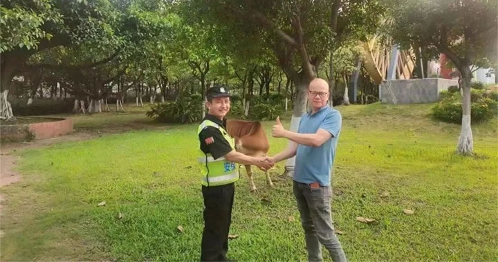 4月20日下午15時(shí)33分,我司派駐的協(xié)管人員王榮在日常巡查時(shí)發(fā)現(xiàn)有一頭牛在大塘鎮(zhèn)興唐崗?fù)じ浇奶幱巫?、無(wú)人看管,疑似農(nóng)戶丟失。為防止阻礙交通,隊(duì)員王榮立即將其牽引到安全位置,并系好牛繩,不讓“迷路”牛再次走丟。同時(shí),為盡快找到失主,防止群眾財(cái)產(chǎn)損失,隊(duì)員王榮隨后拍下牛的照片,上傳至微信工作群,并將具體情況報(bào)告給上級(jí)部門負(fù)責(zé)人。大塘鎮(zhèn)執(zhí)法辦領(lǐng)導(dǎo)得知此事后,立即聯(lián)系鎮(zhèn)農(nóng)辦相關(guān)負(fù)責(zé)人,讓其協(xié)助幫忙將“迷路”牛照片通過(guò)微信發(fā)送至附近的村委干部幫忙辨認(rèn)、查找失主。一個(gè)小時(shí)后,經(jīng)村民辨認(rèn),??赡苁屈S某(化名)家的,大塘鎮(zhèn)執(zhí)法辦立即聯(lián)系黃某,經(jīng)與黃某核對(duì)了牛的特征后,確認(rèn)牛的確是黃某家所丟,隊(duì)員王榮將牛歸還給黃某。牽著失而復(fù)得的牛,黃某難掩喜悅,連聲道謝。隨后,隊(duì)員王榮提醒黃某今后放牛后要多加注意,栓好繩子,避免再次走失。