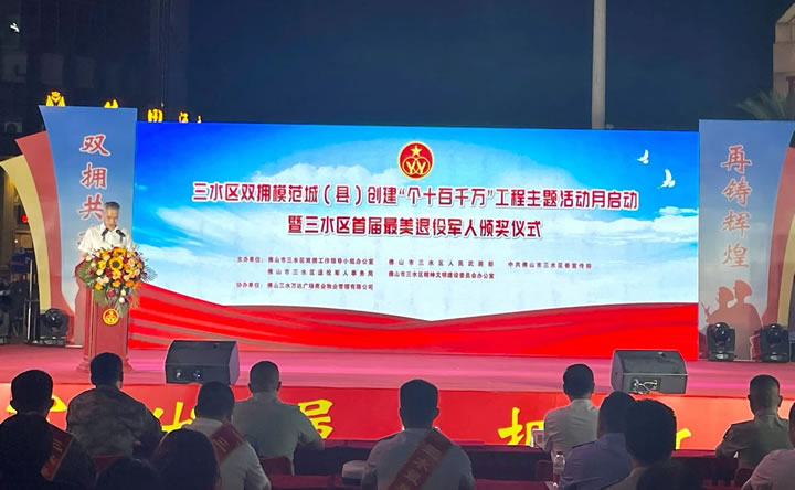 8月29日晚,佛山市三水區雙擁模范城(縣)創建“個十百千萬”工程主題活動月啟動暨三水區首屆最美退役軍人頒獎儀式,在三水萬達廣場舉行。