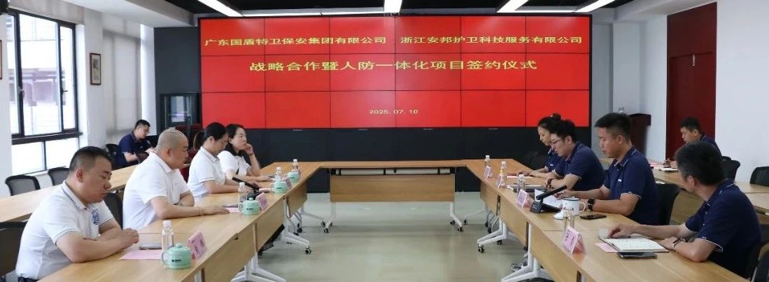 為加速構建全域化安全服務體系,推動保安行業數字化轉型,2025年7月10日上午,廣東國盾特衛保安集團有限公司與浙江安邦護衛科技服務有限公司在杭州正式簽署戰略合作協議及人防一體化項目協議。此次合作是繼今年1月集團黨支部書記、董事長夏學樹率隊赴浙考察后,雙方在科技賦能安保領域邁出的實質性步伐。